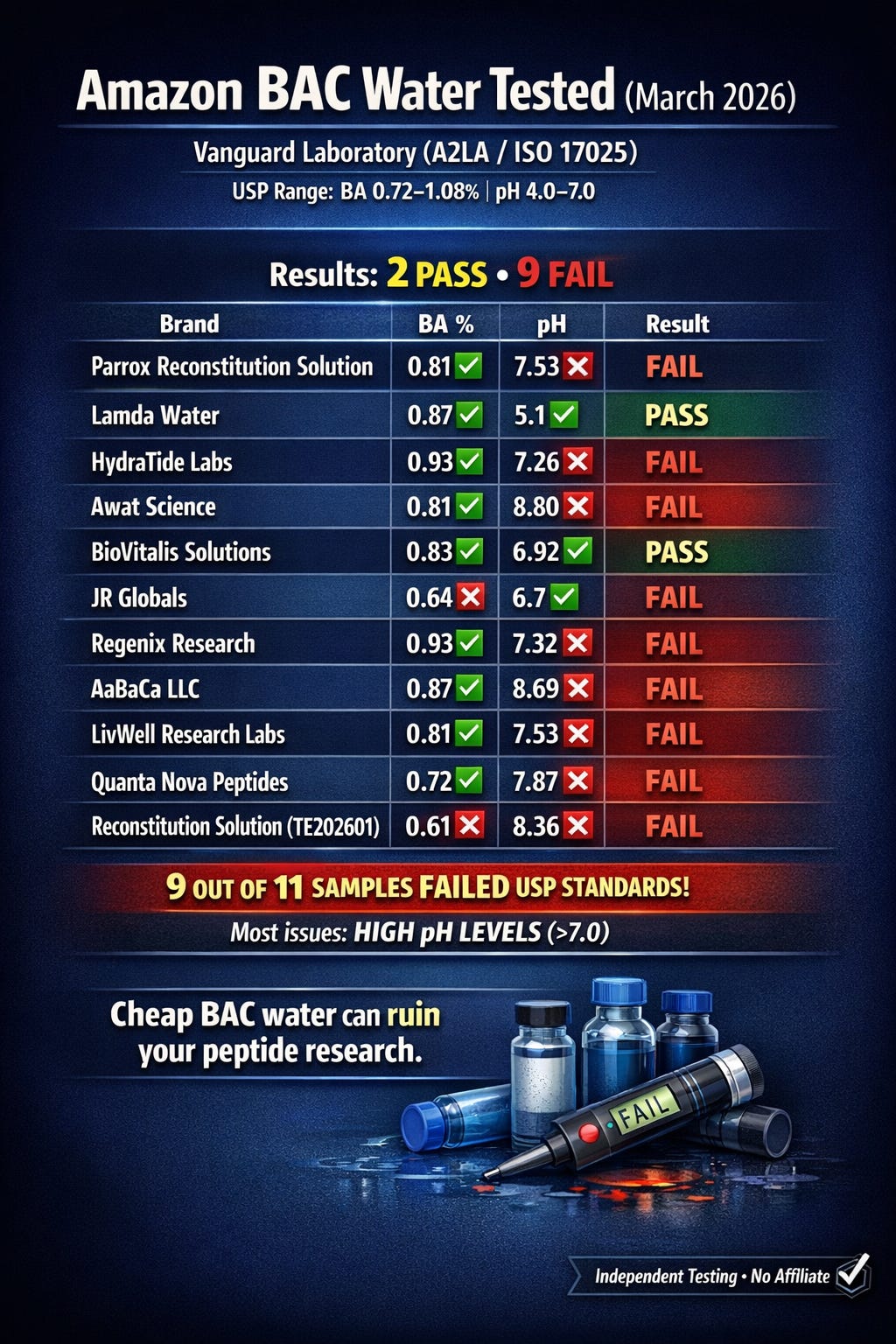 BAC Water Amazon Testing — March 2026 | Only 2 of 11 Passed | Data Shared by Peptide Crafters